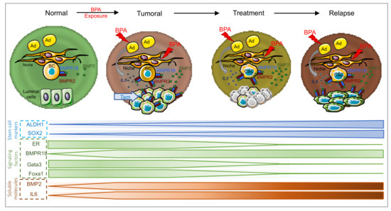 Jung N, Maguer-Satta V, Guyot B. Early Steps of Mammary Stem Cell Transformation by Exogenous Signals; Effects of Bisphenol Endocrine Disrupting Chemicals and Bone Morphogenetic Proteins. Cancers. 2019; 11(9):1351. https://doi.org/10.3390/cancers11091351