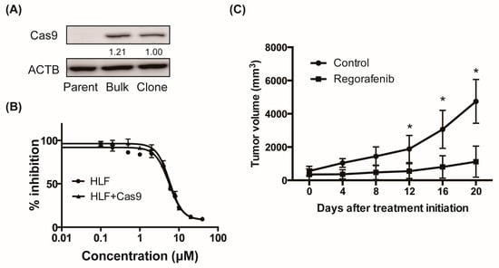 Regorafenib suppresses xenograft tumor growth of the Cas9-expressing hepatocellular carcinoma (HCC) cell line. (A) Western blot (WB) analysis of Cas9 protein levels in the HLF cell line. Parent stands for Cas9-nontransduced parental cells, Bulk stands for Cas9-transduced polyclonal cells, and Clone stands for Cas9-transduced monoclonal cells. Relative band intensity is shown. (B) Half maximal inhibitory concentration (IC50) values of regorafenib against HLF and HLF-Cas9 cells. (C) Nine million Cas9-transduced HLF clone cells per flank were subcutaneously injected into NOD/Shi-scid/IL-2Rγnull (NOG) mice. Once the tumor volume reached 200 mm3, mice were treated with either vehicle or 20 mg/kg regorafenib, and tumor volume was measured at various times (N = 4 for each, * p < 0.05).