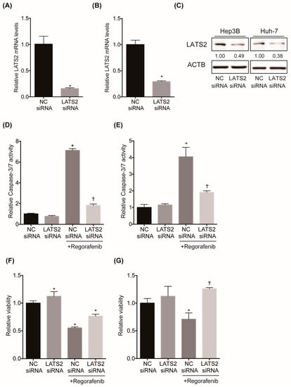 Inhibition of LATS2 confers regorafenib resistance to HCC cell lines. (A,B) LATS2 mRNA levels in Hep3B (A) and Huh-7 (B) cells 4 days after transfection with the negative control (NC) or LATS2 siRNA (N = 4 for each and * p < 0.05). (C) LATS2 protein levels in Hep3B and Huh-7 cells 4 days after transfection with the NC or LATS2 small interfering RNA (siRNA). Relative band intensity is shown (D,E). Three days after transfection with the NC or LATS2 siRNA, cells were treated with either DMSO or 2 μM regorafenib for 48 hours. Apoptosis was assessed by the caspase-3/7 activity of the culture supernatant in Hep3B (D) and Huh-7 (E) cells (N = 4 for each and *, † p < 0.05 vs. all). (F,G) Three days after transfection with the NC or LATS2 siRNA, cells were treated with either DMSO or 2 μM regorafenib for two days. Cell viability was measured by WST-1 assays in Hep3B (F) and Huh-7 (G) cells (N = 4 for each and * p < 0.05 vs. all and † p < 0.05 vs. NC siRNA and NC siRNA + regorafenib).
