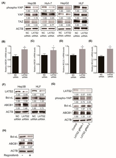(A) WB analysis of phosphorylated YAP, whole YAP and TAZ protein levels in four human liver cancer cell lines four days after transfection with the NC or LATS2 siRNA. Relative band intensity is shown. (B,C) ABCB1 mRNA levels in Hep3B (B) and HLF (C) cells three days after transfection with the NC or LATS2 siRNA (N = 4 for each and * p < 0.05). (D,E) BCL2L1 mRNA levels in Hep3B (D) and HLF (E) cells three days after transfection with the NC or LATS2 siRNA (N = 4 for each and * p < 0.05). (F) WB analysis of the protein levels of LATS2, Bcl-xL, and ABCB1 in Hep3B and HLF cells five days after transfection with the NC or LATS2 siRNA. Relative band intensity is shown. (G) WB analysis of the protein levels of LATS2, phosphorylated YAP, Bcl-xL and ABCB1 in Cas9-expressing HLF cells transduced with negative control gRNA or LATS2 gRNA. Relative band intensity is shown. (H) WB analysis of the protein levels of Bcl-xL and ABCB1 in Hep3B cells treated with either DMSO or 2 μM regorafenib for 48 hours. Relative band intensity is shown.