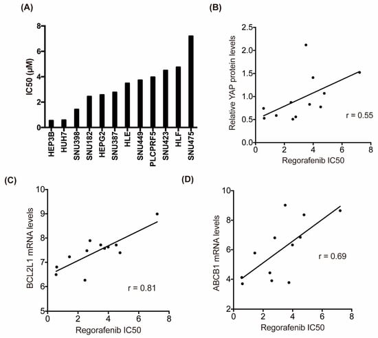 Hippo signaling activity may mediate the susceptibility of HCC cells to regorafenib. (A) IC50 values of regorafenib against 12 human liver cancer cell lines. (B–D) Correlation between the IC50 values of regorafenib and YAP protein levels (B) or BCL2L1 mRNA levels (C) or ABCB1 mRNA levels (D) against 12 human liver cancer cell lines. The Pearson correlation coefficient is shown as the r value.