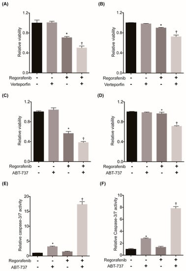 To clarify the causal relationship between YAP activation and regorafenib susceptibility, we examined the effect of suppressing YAP on the cytotoxicity of regorafenib in HCC cells. We selected HLF and SNU-475 cells, which showed the highest IC50 values of regorafenib and YAP among the 12 HCC cell lines, and treated them with the YAP inhibitor verteporfin. While verteporfin treatment alone did not affect cell viability, YAP inhibition significantly augmented the cytotoxicity of regorafenib in these cells (Figure 6A,B). We also confirmed that siRNA-mediated YAP knockdown also significantly augmented the cytotoxicity of regorafenib (Supplementary Figure S3A). These findings demonstrated that YAP activation contributed to chemoresistance to regorafenib in HCC cells. We also examined the involvement of the YAP downstream target gene Bcl-xL in regorafenib efficacy. Similar to YAP inhibition, Bcl-xL inhibition by ABT-737, a Bcl-xL/Bcl-2/Bcl-w inhibitor, significantly enhanced cytotoxicity induced by regorafenib (Figure 6C,D) in HLF and SNU-475 cells. We also observed a significant elevation in caspase-3/7 activity in both cell lines when treated with both regorafenib and ABT-737 compared to treatment with either single agent (Figure 6E,F). We also confirmed that siRNA-mediated Bcl-xL knockdown significantly enhanced the cytotoxicity of regorafenib with marked elevation of caspase-3/7 activity (Supplementary Figure S3B,C). Collectively, these data also suggest that the suppression of YAP or its downstream antiapoptotic machinery in combination with regorafenib could be a potential therapeutic for regorafenib-insensitive HCC cell lines.