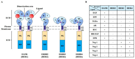 The extracellular ligand-binding domain of EGFR contains four distinct subdomains (I–IV) [32] (Figure 1A). Domains I and III participate in ligand binding. Domains II and IV participate in disulfide bond formation [33,34]. Domain II participates in homo- and heterodimer formation with ErbB family members [35]. In response to ligand binding, homodimerization and/or heterodimerization with other family members can activate the tyrosine kinase activity of EGFR [35]. Ligands for EGFR include EGF, extracellular protein factor (EPF), TGF-α, amphiregulin (AR), betacellulin (BTC), epiregulin (EPR), and heparin-binding EGF-like growth factor [36] (Figure 1B). HER2 does not have ligands (Figure 1B). Nrg-1 and Nrg-2 are ligands for HER3 [37] (Figure 1B).