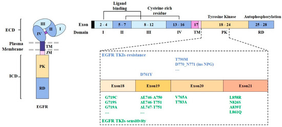 Activating mutations in the tyrosine kinase domain of the EGFR among NSCLC cells can enhance responses to EGFR-tyrosine kinase inhibitors (EGFR-TKIs) [46] (Figure 2). Point mutations in exon 18 [47,48], exon 20 [49], and exon 21 [50] are associated with sensitivity to EGFR-TKIs (Figure 2). Short deletions in exon 19 also confer sensitivity to EGFR-TKIs [51].