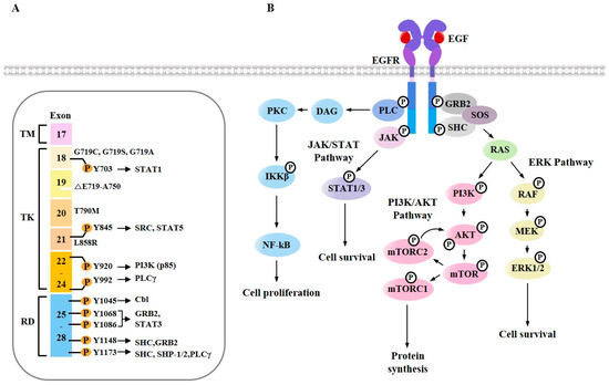 Ligand-dependent EGFR signaling pathways. (A) The proteins recruited on tyrosine-phosphorylated EGFR residues are shown. Numbers correspond to amino acids of EGFR. TM denotes transmembrane domain, TK denotes tyrosine kinase domain, and RD denotes regulatory domain. Specific mutations in the kinase domain and regulatory domain of EGFR are shown. Δ denotes deletions. (B) EGFR activates RAS/MAPK and JAK/STAT signaling pathways for cell survival. Activation of PI3K/AKT/mTOR signaling pathway leads to protein synthesis. EGFR activates Phospholipase C gamma (PLCγ), which in turn activates PKC/IKKβ/NF-κB signaling pathway.