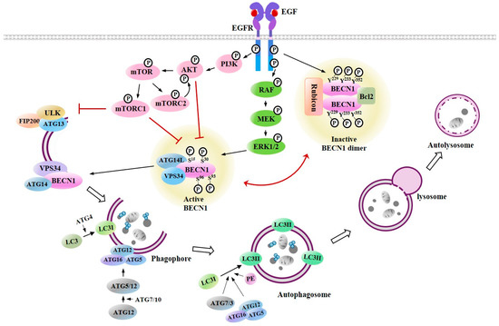 EGFR tyrosine kinase can induce the tyrosine phosphorylation of Beclin1 (pY229, pY233, and pY352), forming Beclin1 homodimers, and inhibiting autophagy (Figure 4). The tyrosine phosphorylation of Beclin1 triggers the disassembly of the Beclin1-VPS34 complex and leads to the inhibition of autophagy (Figure 4). Rubicon and Bcl-2 then bind to Beclin1 and act as negative regulators of autophagy [80] (Figure 4). EGFR activates the mechanistic target of the rapamycin complex 1 (mTORC1) pathway (Figure 4) and can act as a negative regulator of autophagy [81,82,83]. The active mTORC1 complex will decrease Beclin1-VPS34 activity, inactivate ULK1, and suppress autophagy [84] (Figure 4). MTORC2 leads to the stabilization and activation of AKT1 [85] (Figure 4). EGFR/RAS/RAF/MEK/ERK signaling activates autophagy by inducing the serine phosphorylation of Beclin1 (Figure 4). These findings suggest that there is a cross talk between EGFR signaling and autophagy.