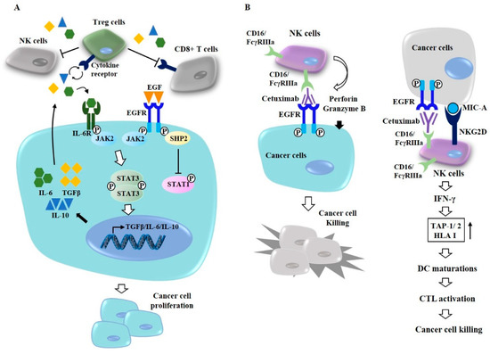 Antibody-dependent cell-mediated cytotoxicity mediates cytotoxic effect of cetuximab. (A) Upon binding of EGF, EGFR activates JAK2, which in turn leads to the activation of STAT3. STAT3 increases expression of immune suppressive cytokines, such as IL-6, IL-10, and TGF-β. IL-6, in autocrine fashion, binds to and activates IL-6 receptor. This binding activates STAT3. EGFR signaling activates regulatory T cells (Treg cells). Activated Treg cells suppress cytotoxic effects of natural killer cells (NK cells) and CD8+ T cells. IL-10 and TGF-β can also activate Treg cells. (B) Cetuximab-activated NK cells display cytotoxic effects against cancer cells by perforin and granzyme B (left). Cetuximab-activated NK cells interact with cancer cells through natural killer group 2 member D (NKG2D)- MHC class I chain-related gene A (MIC-A) binding. This interaction induces dendritic cell (DC) maturation by increasing expression levels of transporter 1 ATP-binding cassette sub-family B(TAP-1)/transporter 2 ATP-binding cassette sub-family B (TAP-2) and human leukocyte antigen I (HLA I) via interferon (IFN)-γ. DC maturation enhances cytolytic T lymphocytic activity towards cancer cells (right).