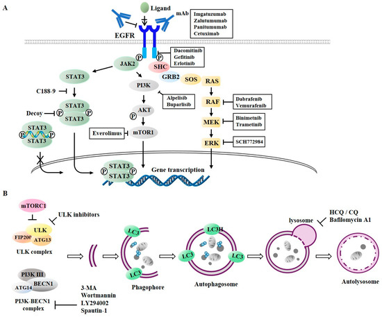 Anti-cancer drugs targeting EGFR signaling and autophagy. (A) Anti-EGFR monoclonal antibodies (mAbs) targeting EGFR include cetuximab, panitumumab, zalutumumab, and imgatuzumab. These mAbs bind to extracellular domain of EGFR and inhibit binding of ligands to EGFR. EGFR-TKI such as erlotinib targets intracellular tyrosine kinase domain to inhibit autophosphorylation of EGFR. Buparlisib and Alpelisib target PI3 Kinase. Everolimus targets mTOR activity and PI3K signaling. SCH772984 targets ERK activity. (B) Wortmannin, 3-methyladenine (3-MA), and LY294002 inhibit VPS34 complex formation. Spautin-1 promotes its degradation. Hydroxychloroquine (HQ), chloroquine (CQ), and bafilomycin A1 inhibit fusion of autophagosome with lysosome.