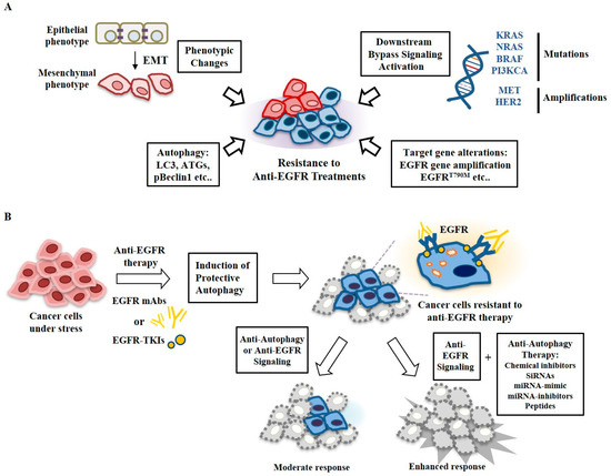 Targeting autophagy may overcome resistance to anti-EGFR treatments. (A) Resistance to anti-EGFR treatments develops from mutations and amplifications, phenotypic changes, and autophagy. (B) Anti-EGFR treatments such as anti-EGFR mAbs and EGFR-TKIs induce protective autophagy in cancer cells, which confers resistance to these anti-EGFR treatments. Targeting both EGFR and autophagy may overcome resistance to anti-EGFR treatments. Anti-autophagy therapy includes miRNA-mimic, miRNA-inhibitors, peptides, and small interfering RNAs (siRNAs).