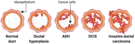 Carcinoma of the breast can arise from either the lobular or the ductal epithelium. Lobular carcinomas are less prevalent than ductal, accounting for 4–10% of diagnoses from breast biopsies [1]. Before BCa reaches the invasive stage at which point it can spread to the rest of the body, it is referred to as a pre-invasive lesion (Figure 1). In pre-invasive lesions, the cancerous cells are confined to the ducts or lobules from which they originate and have not yet broken the basement membrane [2]. The pre-invasive lesions in ductal carcinoma are categorized as either atypical ductal hyperplasia (ADH) or ductal carcinoma in situ (DCIS). It can be difficult to histologically distinguish ADH lesions from that of low-grade DCIS, as the lesions look similar and ADH is mostly identified through failing to meeting the diagnostic criteria for DCIS [3,4]. Ducts exhibiting abnormal proliferation that receive a diagnosis of ADH are partially or completely filled with uniform and polarized cells. These cells are hyperchromatic, and the extent of proliferation is greater than that found in usual ductal hyperplasia [4]. Ducts affected by ADH are small, typically defined as less than or equal to 2 millimetres (mm) in size, and are usually found alone or in small, clustered foci [3]. Not all ADH lesions will progress to carcinoma [5], however women with a diagnosis of ADH are four times more likely to develop BCa [6].
