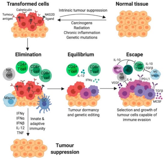 This gives rise to the cancer immunoediting hypothesis. Here, it is postulated that the immune system exerts both host-protective and tumour-stimulating actions [17]. Cancer immunoediting is multifaceted and composed of three fundamental phases: elimination, equilibrium and escape (Figure 2) [18]. Initially, tumour-specific antigens are recognised by the innate and adaptive arms of the immune system and elicit a pro-inflammatory response [18]. The cancer immunosurveillance network acts in cohesion to eliminate developing tumour cells, thereby preventing further tumourigenesis. Tumours only progress to the equilibrium phase if immunosurveillance is unsuccessful or impaired. Subsequently, cancerous cells persisting habitually in equilibrium with their microenvironment are more equipped to mutate and produce new populations of tumour variants [18]. Modifications to tumour cells can allow them to ultimately employ immunosuppressive mechanisms, thus evading and essentially escaping the immune system in the final phase [18]. These immunologically sculpted tumours grow with fewer selective pressures, actively induce an immunosuppressive microenvironment and become evident clinically.