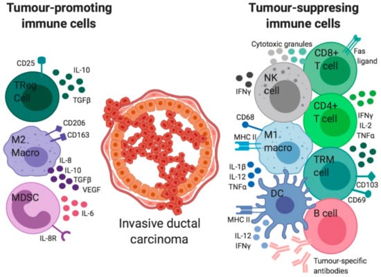 The immune microenvironment of invasive ductal carcinoma. Subsets of the immune system can elicit both tumour-promoting and tumour-suppressing effects. Immune inhibition of tumours is largely driven by the activity of CD8+ T cells, CD4+ T cells, Tissue-resident T (TRM) cells, B cells, Natural Killer (NK) cells, M1 macrophages and dendritic cells (DC). The tumour-fighting immune landscape produces cytokines that inhibit tumour development (including IFNγ, TNFα, IL-1β, IL-2 and IL-12). CD8+ T cells and NK cells also secrete cytotoxic granules that trigger tumour cell apoptosis. Similarly, B cells secrete tumour-specific antibodies that target tumour cells for elimination. In contrast, the immune stimulation of tumours is promoted by Regulatory T (TReg) cells, M2 macrophages and Myeloid-derived suppressor cells (MDSCs), which act to suppress their anti-tumour immune counterparts and facilitate tumour growth. These cells release immuno-inhibitory pro-tumour cytokines (TGFβ, VEGF, IL-6, IL-8 and IL-10) [37,38,39,40,41].