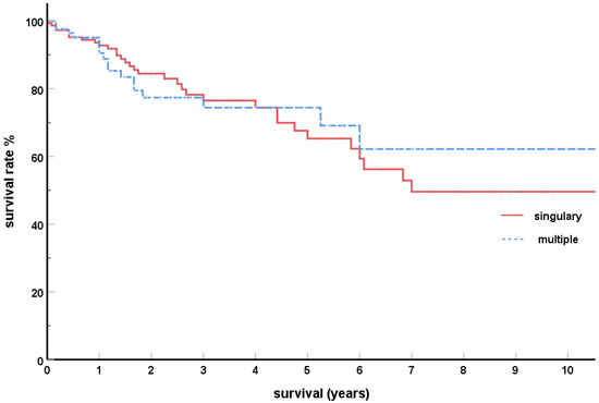 An average number of 3.1 (SD 1.5) pancreatic foci was determined based on the multiple reports, with up to 7 foci being reported [120,147], and even 14 in an individual case [168]. The results of the comparative analysis (Table 2) show that the two collectives of singular and multiple metastases do not differ significantly with regard to age, frequency of synchronous/metachronous metastases, interval until development of metastases, distribution of the grading levels, and cumulative 5-year SVR (Figure 1).