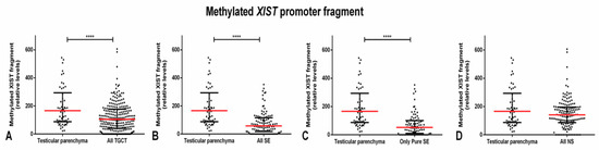 Methylated XIST fragment relative amounts in testicular germ cell tumors and testicular parenchyma of the discovery cohort. Relative amounts of the methylated XIST fragment among testicular parenchyma samples and (A) all testicular germ cell tumors (TGCTs), (B) all seminomas (SEs), (C) only pure SEs, and (D) all non-seminomas (NSs). **** indicate p < 0.0001. Abbreviations: NS—non-seminoma; SE—seminoma; TGCT—testicular germ cell tumor.