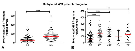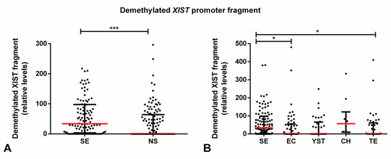 However, SE samples were found to exhibit a higher relative amount of the demethylated XIST fragment as compared with NS (p < 0.001), with the same occurring when compared individually to EC and TE tumor subtypes (adjusted p-value < 0.05, Figure 4).
