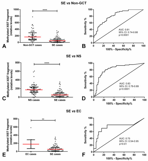 The relative amount of the methylated XIST fragment in SE cases was significantly lower as compared to patients with no GCT pathology, cases with NS, and specifically cases with pure EC (p < 0.0001, p < 0.0001, p < 0.01, respectively). Methylated XIST fragment relative amount allowed for a good discrimination among these groups, with an area under the curve (AUCs) of 0.81, 0.83 and 0.75, respectively (Figure 3). This allowed for a good performance in the discrimination, with sensitivity, specificity, and accuracy consistently above 70% (Table 1).