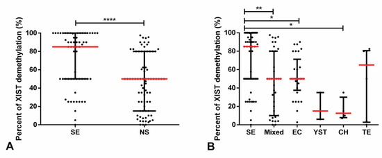 Moreover, SEs exhibited a significantly lower amount of methylated XIST fragment as compared with NS components (p < 0.0001) and there were also significant differences in the amount of methylated XIST fragment among the various individual tumor subtypes (p < 0.0001). When each of the five histological tumor components were considered individually, SE subtype showed a lower amount of this fragment in comparison with EC and YST (adjusted p-value < 0.0001) and TE (adjusted p-value < 0.01) (Figure 2).