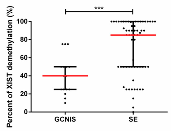 Moreover, demethylated XIST was also detected in 16 of 17 (94.1%) GCNIS lesions. Despite the reported crescent XIST expression in cases with increasingly more GCNIS content [12], we did not find the same positive correlation between the extent of GCNIS and the degree of XIST demethylation (data not shown). However, the percentage of demethylated XIST was significantly lower in GCNIS lesions as compared with overt SE (p = 0.0001, Figure 6).