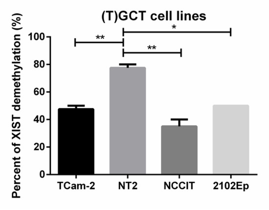 Demethylated XIST fragment percentage in germ cell tumor cell lines. ** indicates p < 0.01 and * indicates p < 0.05. Abbreviations: TGCT—testicular germ cell tumor.