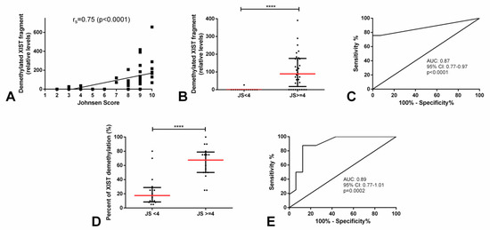 Demethylated XIST fragment relative amounts in testicular parenchyma with various Johnsen’s scores (discovery and validation cohorts). (A) Correlation between Johnsen’s score and relative amounts of demethylated XIST fragment; (B) relative amounts of the demethylated XIST fragment in high and low Johnsen’s score groups, respective ROC curve in (C); and (D) percentage of the demethylated XIST fragment in high and low Johnsen’s score groups, respective ROC curve in (E). **** indicates p < 0.0001. Abbreviations: AUC—area under the curve and JS—Johnsen’s score.