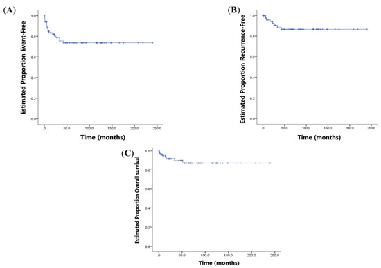 Overall cumulative survival curves for event-free survival (A), recurrence-free survival (B), and overall survival (C) in 84 patients with hepatoblastoma.