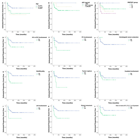 Kaplan–Meier curves of event-free survival (EFS) according to age (A), serum alpha-fetoprotein (AFP) levels at initial presentation (B), PRETEXT group (C), HV or IVC involvement (D), portal vein involvement (E), extrahepatic tumor extension (F), multifocality (G), tumor rupture (H), caudate involvement (I), lymph node involvement (J), distant metastasis (K), and presence of one or more of VPEFR (L). The detailed information for each graph is described in the supplementary figure legend.