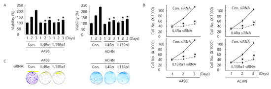 Recent reports showed that IL4Rα and IL13Rα1 are overexpressed and activated in various types of epithelial tumor such as malignant glioma, ovarian, lung, pancreas, and colon carcinoma [17,62]. Therefore, IL4Rα and IL13Rα1 might be an effective therapeutic target of various human malignant tumors. Suppression of IL4 and IL13 as well as IL4Rα and IL13Rα1 might be tumor-suppressive especially in poor prognostic group of cancers expressing both IL4Rα and IL13Rα1 as like IL4Rα+IL13Rα1+ subgroup of CCRCC. RNA aptamer-mediated inhibition of IL4Rα induces apoptosis of MDSC and tumor-associated macrophage (TAM) which is associated with the tumoral immune escape [63]. Joshi et al. showed the higher expression of IL4Rα in anaplastic thyroid cancer (ATC), a highly aggressive thyroid cancer type than other types of thyroid cancer tissue from patients. They designed the IL4-Pseudomonas exotoxin (IL4-PE) conjugate and the treatment of IL4-PE decreased the colony formation ability of thyroid cancer cells and tumor growth in thyroid xenograft tumor model [64]. Furthermore, IL4R plays an essential role in regulating hepatocellular carcinoma (HCC) cell survival, proliferation, and metastasis and regulates the activation of JAK1/STAT6 and Jnk/Erk1/2 pathways [65]. As shown in the Figure 2G, interestingly, the knockdown of the IL4R complex component caused the downregulation of each other. Type II IL4R is composed of IL4Rα and IL13Rαl subunit. We thought that if one of IL4R complex component is ablated by siRNA transfection, this might cause the protein degradation of each components to be accelerated since each component need to be physically interacted to form the functional complex of type II IL4R. We are planning to investigate if the half-life of IL4Rα or IL13Rαl protein is controlled by the proteasomal degradation after transfection of siRNA against IL4Rα or IL13Rαl into ACHN and A498 cells. In this study, knockdown of IL4R prohibited proliferation and induced apoptosis in HCC cells. Vadevoo et al. reported that they synthesized an IL4R-targeting peptide (IL4RPep-1-K) conjugated with the proapoptotic peptide (KLAKLAK)2 and demonstrated this peptide exerted the selective anti-cancer effect against IL4R-expressing tumor in vitro and in vivo (4T1 breast tumor-bearing mice model) [11]. In fact, our laboratory has been developing the novel drug delivery system using ultrasound and microbubble-liposome complex with IL4RPep-1-K to detect and treat IL4R-expressing tumor [66].