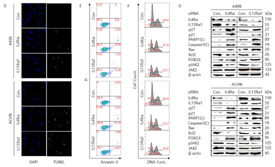 Anti-cancer effect by transfection of siRNA against IL4Rα or IL13Rα1 in A498 and ACHN cells. Time-dependent anti-cancer effect by transfection of siRNA against IL4Rα or IL13Rα1 in A498 and ACHN cells for 24, 48, and 72 h incubation after transfection. Cell viability and proliferation rate was determined by WST-1 assay (A) and cell counting assay (B), respectively. This result is representative data from three biological replicates, and the error bar indicates standard error (STE). * indicates the p-value < 0.05. (C) Anti-colony formation ability by transfection of siRNA against IL4Rα or IL13Rα1 in A498 and ACHN cells was determined by colony formation assay for 14 days after transfection. These results are representative data from three biological replicates. Apoptosis in A498 and ACHN cells transfected with siRNA against IL4Rα or IL13Rα1 for 48 h after transfection was determined by terminal deoxynucleotidyl transferase dUTP nick end labeling (TUNEL) assay (D) and Annexin V staining analysis (E). Cell cycle arrest was determined by cell cycle analysis (F). This result is representative data from three biological replicates. (G) Western blotting analysis of proteins related to apoptosis and cell cycle arrest in A498 and ACHN cells transfected with siRNA against IL4Rα or IL13Rα1 for 48 h after transfection. β-actin was used for a gel-loading control. Magnification for (D): ×20.