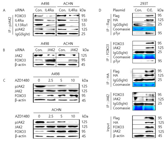 Interaction between Janus kinase 2 (JAK2) and Forkhead box O3 (FOXO3) protein in A498 and ACHN. (A) Silencing IL4Rα in A498 and ACHN cells reduced the interaction between JAK2 and FOXO3. Cells were transfected with control siRNA or siRNA against IL4Rα, and then cell lysates were immunoprecipitated with the anti-pJAK2 antibody. The immunoprecipitated proteins were resolved on the sodium dodecyl sulfate polyacrylamide gel electrophoresis (SDS-PAGE) and immunoblotted by anti-IL4Rα, IL13Rα1, FOXO3, and pJAK2 antibody. The light chain of IgG was used for the loading control. (B) 293T cells were co-transfected with HA- JAK2 and Flag-FOXO3 (O.E.) or a control plasmid DNA (pCMV3-C-HA and pECE, Con.) as indicated. Then cell lysates were immunoprecipitated with anti-Flag, FOXO3, HA, JAK2, or pTyr antibody. The immunoprecipitated proteins were resolved on the SDS-PAGE and immunoblotted by the indicated antibody, respectively. The light chain of IgG and Coomassie Blue staining of SDS-PAGE were used for the loading control. (C) Silencing JAK2 in A498 and ACHN cells increased the expression of FOXO3. Cells were transfected with control siRNA or siRNA against JAK2, and then cell lysates were resolved on the SDS-PAGE and immunoblotted by anti-FOXO3 and JAK2 antibody. β-actin was used for the loading control. (D) Pharmacological inhibition of JAK2 in A498 and ACHN cells increased the expression of FOXO3. Cells were treated with dimethyl sulfoxide (DMSO) vehicle control or the indicated concentration of AZD1480, and then cell lysates were resolved on the SDS-PAGE and immunoblotted by anti-FOXO3, pJAK2, and JAK2 antibody. β-actin was used for the loading control.