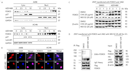 The half-life of FOXO3 protein is controlled by the proteasomal degradation after its phosphorylation [46,47,48]. Since we could find that FOXO3 protein interacts with JAK2 protein and the tyrosine-phosphorylation of FOXO3 was induced by JAK2, we tried to determine whether JAK2 affects the FOXO3 protein location, level, and ubiquitination status. As shown in Figure 4A, the cytoplasmic level of FOXO3 protein was decreased by AZD1480 treatment in A498 and ACHN cells, while the nuclear level of FOXO3 protein was significantly increased with a dose-dependent manner. Further, the cytoplasmic level of p27 protein was increased by AZD1480 treatment in a dose-dependent manner. These data were confirmed by the confocal analysis for staining FOXO3 protein in A498 and ACHN cells treated with AZD1480, which showed the nuclear accumulation of FOXO3 after treatment of AZD1480 (Figure 4B). These results suggest that AZD1480 could trigger the translocation of the FOXO3 protein from the cytoplasm into the nucleus in A498 and ACHN cells. Then, we found that the expression level of FOXO3 was decreased within 2 h in 293T cells co-transfected with over-expressing plasmid DNAs (pECE Flag-FOXO3 and pCMV3-C-HA-JAK2) but the expression level of FOXO3 was increased up to 4 h in the same 293T cells treated with AZD1480 with/out the treatment of CHX and MG132 (Figure 4C) suggesting that the proteasomal degradation of FOXO3 is controlled by AZD1480 treatment. Moreover, as shown in Figure 4D, immunoprecipitation analysis result with antibody against Flag after incubation of MG132 showed that poly-ubiquitination of FOXO3 was considerably weakened in 293T cells treated with AZD1480 compared to dimethyl sulfoxide (DMSO) vehicle control which is consistent with the above experimental results about the proteasomal degradation of FOXO3.
