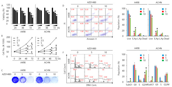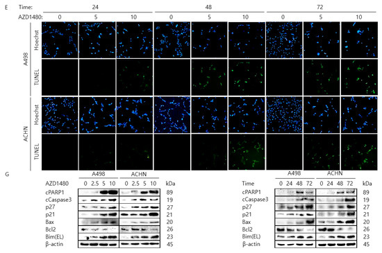 Anti-cancer effect by AZD1480 treatment in A498 and ACHN cells. (A) Dose and time-dependent anti-cancer effect by the indicated concentration of AZD1480 treatment in A498 and ACHN cells for 24, 48, and 72 h. Cell viability and proliferation rate was determined by WST-1 assay (A) and cell counting assay (B), respectively. This result is representative data from three biological replicates, and the error bar indicates standard error (STE). * indicates the p-value < 0.05. (C) Anti-colony formation ability by the indicated concentration of AZD1480 treatment in A498 and ACHN cells was determined by colony formation assay for 14 days. This result is representative data from three biological replicates. Apoptosis in A498 and ACHN cells treated by the indicated concentration of AZD1480 was determined by Annexin V staining analysis (D) and TUNEL assay (E). Live: live cells, E.Ap: early apoptotic cells, L.Ap: late apoptotic cells, and dead: dead cells. Cell cycle arrest was determined by cell cycle analysis (F). These results are representative data from three biological replicates. (G) Dose and time-dependent western blotting analysis of proteins related to apoptosis and cell cycle arrest in A498 and ACHN cells treated by the indicated concentration of AZD1480. β-actin was used for a gel-loading control. Magnification for (E): ×20.
