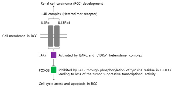 Collectively, we investigated a biochemical mechanism to explain the relationship between IL4Rα and IL13Rα1 expressions, as well as the shorter survival see in CCRCC patients [99]. We demonstrated that IL4Rα and IL13Rα1 are associated with the proliferation of RCC cells and the protein stability of FOXO3 via JAK2. We showed a novel signaling pathway underlying the ubiquitination mediated degradation of FOXO3 protein depending on its tyrosine phosphorylation by JAK2, leading to contribute to RCC development. To the best of our knowledge, this is the first report that JAK2 is shown to regulate FOXO3 protein stability. Based on our findings, we proposed a schematic model for a novel role of JAK2 under IL4Rα and IL13Rα1 in regulating FOXO3 protein degradation and promoting RCC tumorigenesis (Figure 6). Our findings imply that IL4Rα and IL13Rα1 as a new prognostic marker. Further, the study implies that JAK2/FOXO3 are new therapeutic targets against RCC. Our findings support the notion that a unique oncogenic JAK2 mediates the degradation of FOXO3 protein and contributes to an understanding of the control of FOXO3 protein in the tumor.