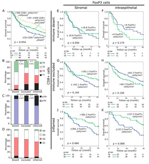 Subgroups “immune desert”, “immune excluded” and “inflamed”. “Immune desert” was defined as having ≤ 50 CD8+ cells/mm2 in the stromal compartment, “immune excluded” ≤ 500 CD8+ cells in the intraepithelial and > 50 in the stromal compartment and “inflamed” having > 500 cells in the intraepithelial compartment. Kaplan Meier plots for overall survival in these groups (A) Tumor size (B) p16 staining (C) and tumor grade (D) were compared. Kaplan-Meier plots for the FoxP3+ cell densities in the stromal and intraepithelial compartment in the “immune desert” group (E,F), in the “immune excluded” group (G,H), and the “inflamed” group (J,K) Cut-off values were median FoxP3+ densities.