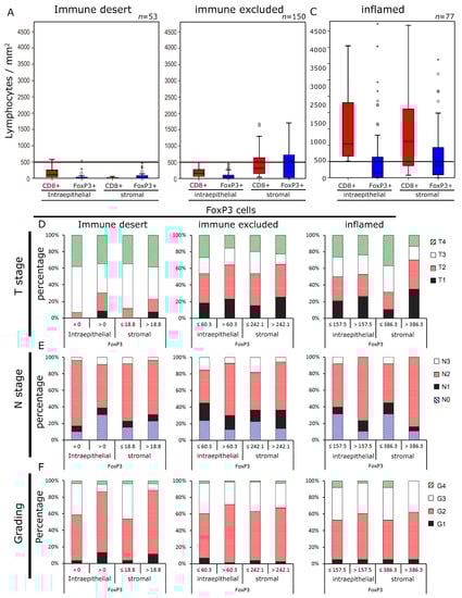 Lymphocyte densities and clinical characteristics in the “immune desert”, “immune excluded” and “inflamed” groups. Lymphocyte densities (cells mm−2) in the intraepithelial and stromal compartment of the “immune desert”. (A) the “immune excluded”. (B) and the “inflamed” group. (C) Tumor size. (D) N stage E and tumor grade. (F) in the three subgroups depending on the FoxP3+ densities are depicted. Cut-off values were the median FoxP3+ densities.