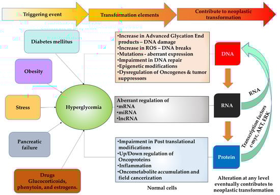 Besides directly affecting genetic stability, hyperglycemia also causes epigenetic dysregulation, leading to a series of downstream signaling cascades, which, in turn, increases the risk of neoplastic transformation [].