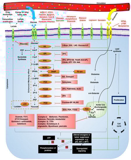 For upregulation of metabolism, molecules such as GLUTs, and their translocation to the membrane—together with upregulation of glycolytic enzymes—are essential. These events take place under the aberrant expression of oncogenes/tumor suppressors such as PI3K, AKT, p53, and RAS []. However, the activation of potential oncogenes and tumor suppressors can occur only subsequent to an increase in ATP production. The GLUT family of receptors are often upregulated in different cancers; GLUT-1 is upregulated in a number of cancers [], GLUT-2 in hepatocellular carcinoma (HCC) [], GLUT-3 in endometrial cancer [], GLUT-4 in prostate cancer [], GLUT 8 in breast cancer [], and GLUT 12 in breast and prostate cancer []. Numerous small molecule inhibitors and chemical approaches have been devised to block these receptors as strategies to treat cancers (Table 1).
