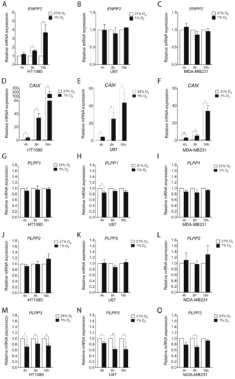 Given that tumor progression is associated with both an increase in the concentration of LPA within the tumor microenvironment and the extent of hypoxic areas within tumors [6,13,35,46], we sought to determine the impact of the hypoxic tumor microenvironment on the main enzymes that regulate LPA levels through its production and metabolism. To address this question, we first investigated the hypoxic regulation of the major LPA producing enzyme, ATX in diverse cancer cell lines including HT1080 fibrosarcoma, U87 glioblastoma, and MDA-MB231 breast cancer. A significant increase in ATX (ENPP2) mRNA expression was observed following 8 or 16 hours of hypoxic (1% O2) stimulation in HT1080 cells (Figure 1A). In contrast, U87 or MDA-MB231 cells showed no significant modulation (Figure 1B,C) despite a significant increase in mRNA expression of CAIX, an intrinsic marker of hypoxia (Figure 1D–F). These changes in mRNA expression correlated with protein expression for ATX (Supplementary Materials, Figure S1A).