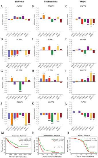 Correlation between ATX and LPP gene expression with a hypoxia gene signature and risk of mortality in patient cohorts. TCGA RNAseq data was used to measure Spearman r correlation coefficient of (A–C) ENPP2 (autotaxin), (D–F) PLPP1 (LPP1), (G–I) PLPP2 (LPP2) or (J–L) PLPP3 (LPP3) RNA expression with hypoxia-induced genes in (A,D,G,J) fibroblastic sarcoma (N = 86), (B,E,H,I) glioblastoma (N = 166), or (C,F,I,L) basal breast cancer (N = 171) tumor tissue from patient cohorts. (* p < 0.05, ** p < 0.01, *** p < 0.001). (M–O) Kaplan-Meier plots obtained using the SurvExpress online software showing overall survival curves of high- and low-prognostic risk groups based on PLPP3 expression in sarcoma (M), glioblastoma (N) and breast (O) cancer patients cohorts. Log-rank test p-values are presented.