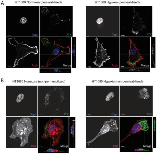 Despite the essential role of ATX in hypoxia-induced invadopodia production, ATX expression levels were not affected in most cell lines tested except a somewhat late 8–16 h, hypoxic induction in HT0180 cells (Figure 1A–C). However, hypoxia is also known to mediate effects by altering the trafficking and subcellular localization of various proteins [38]. Therefore, we sought to determine whether hypoxia might modulate the subcellular localization of ATX. First, HT1080 cells were permeabilized and stained for ATX and actin. Strong ATX staining at the leading edge of cells was observed in hypoxia compared to a more diffuse staining under normoxic conditions (Figure 4A). Because secreted ATX can be recruited to the cell-surface [22], we also performed ATX staining in non-permeabilized cells. Co-staining of the cells with the lipophilic marker DiD and ATX showed localized ATX staining at the cell surface (Figure 4B), as further seen in the associated z-axis images. In hypoxic cells, a prominent cell-surface staining was detected at the leading edge compared to a more diffuse staining under normoxic conditions (Figure 4B). Similar results were observed in hypoxic MDA-MB231 and U87 cells (Supplementary Materials, Figure S4). These findings indicate that the subcellular localization of ATX is altered in hypoxic cells resulting in a marked redistribution of the enzyme to the leading edge.