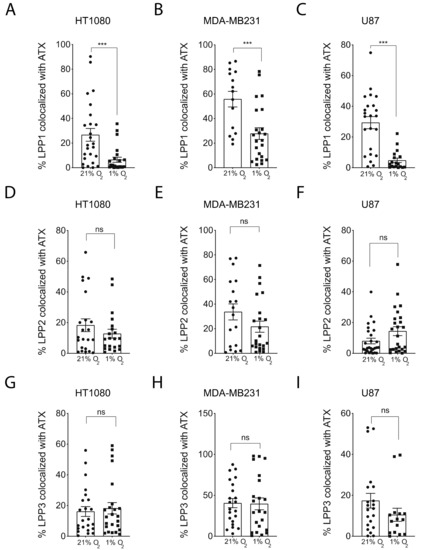 Quantification of the co-localization of ATX and LPPs under hypoxic conditions. Quantification of the percentage of (A–C) LPP1, (D–F) LPP2, or (G–I) LPP3 co-localized with ATX in (A,D,G) HT1080, (B,E,H) MDA-MB231 or (C,F,I) U87 cells cultured on non-fluorescent gelatin for 4 h in normoxia (21% O2) or hypoxia (1% O2). Bars represent the mean ± SEM (*** p < 0.001, ns = non-significant).
