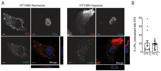 Given that LPAR1 was previously shown to mediate the hypoxic effect on HT1080 cell invasion [45], we next investigated LPAR1 distribution in these cells as well as their potential co-localization with ATX. Results show that LPAR1 are uniformly distributed in cells incubated under normoxic or hypoxic conditions (Figure 7A). Co-localization of LPAR1 with ATX indicates no significant changes in the percentage of co-localization under hypoxic conditions (Figure 7B). Collectively, the results suggest that while ATX and LPP1 are found polarized in opposite directions, LPAR1 is not segregated with either ATX or LPP1.