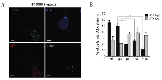 Evaluation of integrin contribution to the subcellular localization of ATX in hypoxic cancer cells. (A) Representative immunofluorescence images of HT1080 cells cultured on non-fluorescent gelatin for 4 h in hypoxia (1% O2) are shown. Cells were stained for ATX (red) and β1 and β3 integrins (green). Nuclei were stained with DAPI (blue). Mask overlay shows co-localization of ATX and integrins (white). Magnification 60×, scale bars, 5 μm. (B) HT1080 cells were plated on non-fluorescent gelatin and incubated with control (ctr) IgG, β1, β3 or β1 and β3 integrin blocking antibodies for 30 min followed by 3 h incubation under hypoxia (1% O2). Cells were then stained for ATX (green) and nuclei were stained with DAPI (blue). The percentage of cells with ATX staining (high/low) is shown. N = 3. Bars represent the mean ± SEM (* p < 0.05, ** p < 0.01).