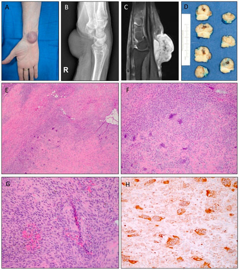 Clinical presentation, radiologic features, and histomorphology of Case 1. (A) A soft tissue mass was seen located on the volar aspect of the wrist. (B) Lateral X-ray of the right wrist revealed a nonspecific mass. (C) Sagittal T1 fat-suppressed postcontrast MRI showed hyperintensity of the lesion. (D) Gross appearance of the excised tumor demonstrated an area of central hemorrhage encased by a partial deep fibrous band. (E) Photomicrograph with low-power magnification showing a cellular neoplasm growing in a vague fascicular pattern with scattered osteoclast-like multinucleated giant cells and areas of hyaline matrix deposition and focal osteoid matrix formation (original magnification ×4). (F) Areas of hypercellularity with stromal hyalinization and osteoid deposition (original magnification ×10). (G) Higher-power magnification demonstrated areas of increased cellularity with spindle cells with enlarged nuclei, open chromatin, and focal enlarged nucleoli. Note the lack of necrosis (original magnification ×20). (H) Tumor cells displayed immunopositivity for CD68, both mononuclear and multinucleated cells.
