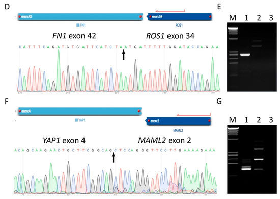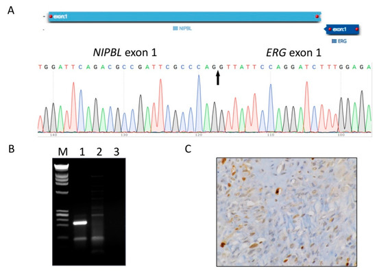 Discovery and validation of the novel gene fusions in atypical TGCTs. A partial sequence chromatogram is shown from each fusion transcript, with the arrow depicting the fusion breakpoint. Gel electrophoresis images display respective cDNA fragment amplification. A positive band can be seen in Lane 1, supporting the presence of the fusion product. M, DNA marker (Promega, Madison, WI, USA); Lane 1, patient case; Lane 2, HapMap normal RNA control; Lane 3, no template control (water control). (A,B) Identification and validation of NIPBL-ERG fusion transcript by anchored multiple PCR (AMP), Sanger sequencing, and RT-PCR. (C) ERG overexpression in the mononuclear tumor cells by immunohistochemistry (IHC). Identification and validation of FN1-ROS1 (D,E) and YAP1-MAML2 (F,G) fusion transcripts by AMP, Sanger sequencing, and RT-PCR.