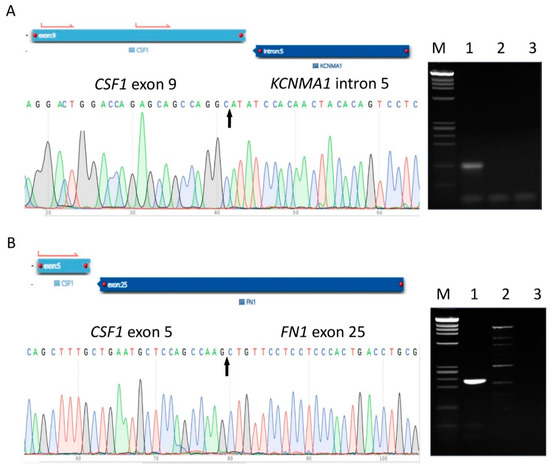 Detection and confirmation of CSF1 partner genes identified in conventional TGCTs. A partial sequence chromatogram is shown from each fusion transcript, with the arrow depicting the fusion breakpoint. Gel electrophoresis images display respective cDNA fragment amplification. A positive band can be seen in Lane 1, supporting the presence of the fusion product. M, DNA marker (Promega, Madison, WI, USA); Lane 1, patient case; Lane 2, HapMap normal RNA control; Lane 3, no template control (water control). Identification and validation of CSF1-KCNMA1 (A) and CSF1-FN1 (B) fusion transcripts by AMP, Sanger sequencing, and RT-PCR.