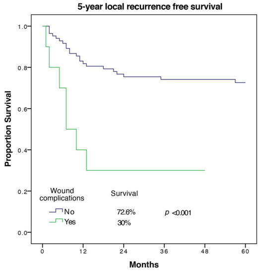 5-year local recurrence free survival of patients with and without wound complications.