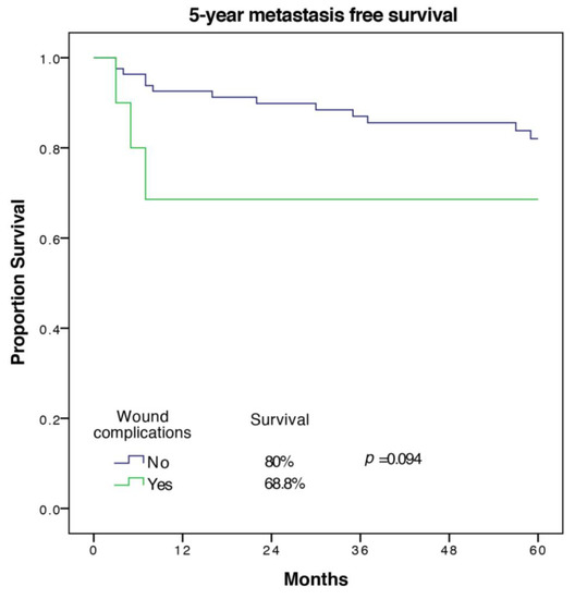 5-year metastasis free survival of patients with and without wound complications.