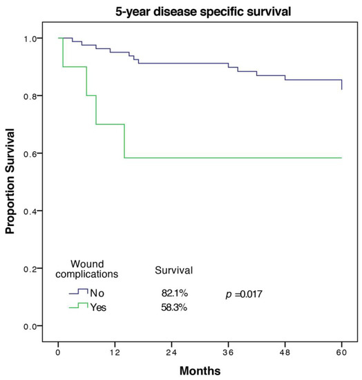 A total of 17 out of 94 patients (18%) died from the underlying disease in the first five years. Factors associated with worse DSS on univariate analysis were age (p = 0.023), cardiovascular morbidity (p = 0.001), tumor size (p = 0.019), UICC-stage (p = 0.046), tumor grade (p = 0.045), wound complication (p = 0.017), and other complication (p = 0.051). Significant predictors of DSS in multivariate analysis with the exclusion of the UICC-stage were cardiovascular morbidity (HR 11.55 (2.23–59.82), p = 0.004), as well as tumor grade and wound complications (HR 5.31 (1.1–25.62), p = 0.037). The Kaplan Meier 5-year DSS curve for wound complications is shown in Figure 3.