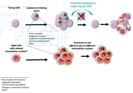 - McKerrell, T.; Vassiliou, G.S. Aging as a driver of leukemogenesis. Sci. Transl. Med. 2015, 7, 306fs38. [Google Scholar] [CrossRef] [PubMed]