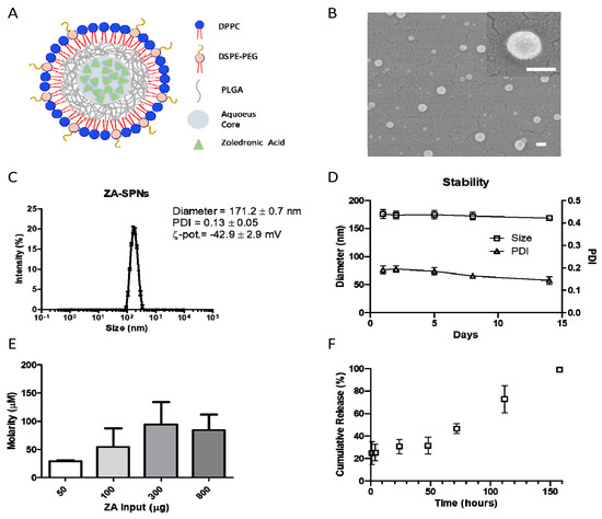 Zoledronic acid–spherical polymeric nanoparticles’ (ZA-SPNs) physico-chemical properties. (A) Schematic of a ZA-SPN. DPPC: 1,2-dipalmitoyl-sn-glycero-3-phosphocholine; DSPE-PEG: 1,2-distearoyl-sn-glycero-3-phosphoethanolamine-N-[succinyl(polyethylene glycol)-2000]; PLGA: Poly(D,L-lactide-co-glycolic) acid. (B) SEM images of ZA-SPNs, showing their spherical shape and dimension (enlargement in the upper-right corner). Scale bar: 100 nm. (C) Size distribution of ZA-SPNs; polydispersity index (PDI) and ζ-potential values are also shown. (D) Size and PDI stability over time of ZA-SPNs. (E) ZA-SPNs batch average molarity (µM) obtained for different input amounts of ZA in the synthesis process, showing 300 μg as the best input condition. (F) Release profile of ZA from ZA-SPNs, showing the minimal ZA loss within the first 48 h. Panels C–F: mean values ± SD.
